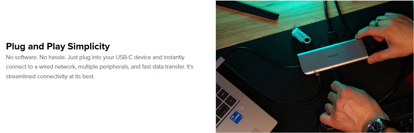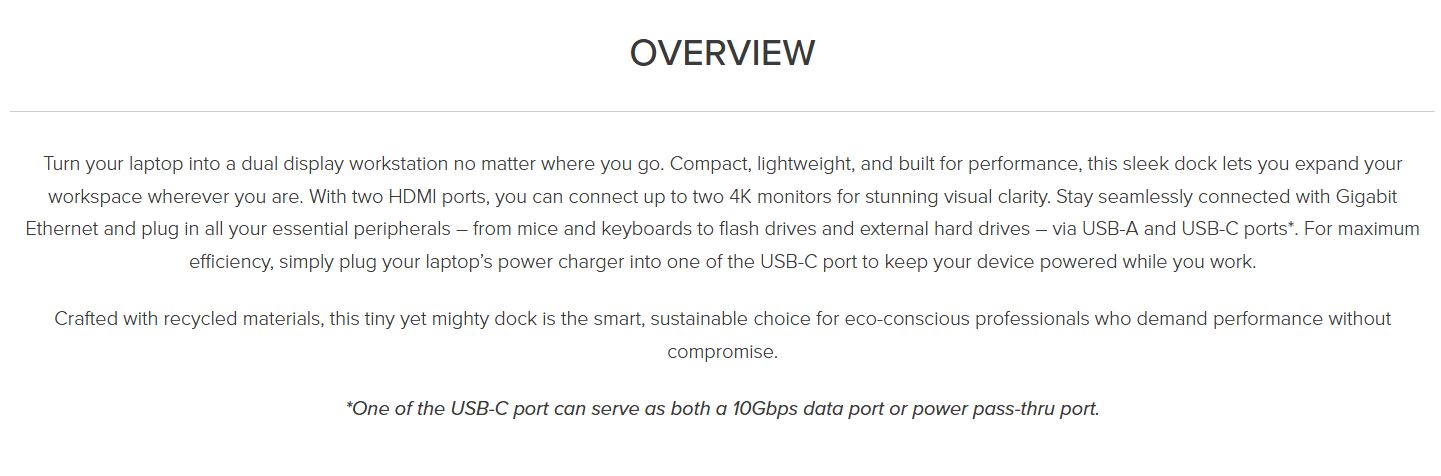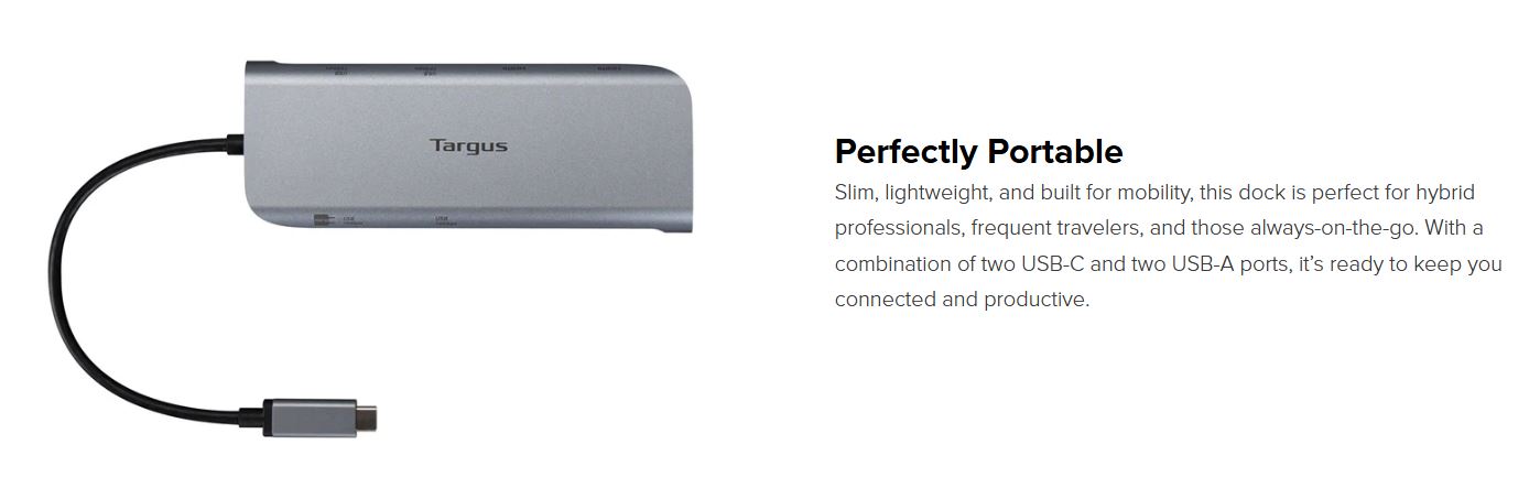 Targus Dual Video Mobile Dock with 140W EPR Pass-Thru USB-C 3.2 Ethernet 2xHDMI 2x USB-A 2xUSB-C Silver USB-C with 140W PD 3Y WTY Overview Turn your laptop into a dual display workstation no matter where you go. Compact, lightweight, and built for performance, this sleek dock lets you expand your workspace wherever you are. With two HDMI ports, you can connect up to two 4K monitors for stunning visual clarity. Stay seamlessly connected with Gigabit Ethernet and plug in all your essential peripherals – from mice and keyboards to flash drives and external hard drives – via USB-A and USB-C ports*. For maximum efficiency, simply plug your laptop’s power charger into one of the USB-C port to keep your device powered while you work. Crafted with recycled materials, this tiny yet mighty dock is the smart, sustainable choice for eco-conscious professionals who demand performance without compromise. Dual Video Support Unlock a rich, ultra-high-definition viewing experience with dual HDMI ports that support up to 4K resolution – whether you're using a single display or going full dual-screen*. Perfect for multitaskers, creatives, and anyone who thrives with more screen real estate. Amped up Charging Power your high-performance laptop with up to 140W PD EPR Power Delivery pass-through**, this dock keeps your USB-C laptop charged and ready by simply connecting your laptop’s power adapter to the dock’s USB-C port. Ideal for devices with limited ports – no compromises, just seamless power. Perfectly Portable Slim, lightweight, and built for mobility, this dock is perfect for hybrid professionals, frequent travelers, and those always-on-the-go. With a combination of two USB-C and two USB-A ports, it’s ready to keep you connected and productive. Plug and Play Simplicity No software. No hassle. Just plug into your USB-C device and instantly connect to a wired network, multiple peripherals, and fast data transfer. It’s streamlined connectivity at its best. Eco-Friendly Exterior Made with 75% recycled post-consumer plastics and aluminum, this EcoSmart™ dock combines outstanding performance with a commitment to sustainability, contributing to a greener future without compromising on speed or reliability. Specifications Connection Technology USB 3.2 Gen 2 Type-C (10 Gbps) + 140W PD ERP Pass-thru Host Port Compatibility USB-C Works With Windows, macOS, iPadOS, ChromeOS, Linux, DeX Ethernet Yes Max Host Power 100W Pass-Thru Power Source Pass-thru HDMI 2 Total USB-A Ports 2 USB-C Ports / 3.2 Gen 2 2 Color Silver Dimensions 5.6' x 2.06' x 0.69' (L x W x H) Weight 0.35 lbs Warranty 3-Year Limited Warranty TAA Compliant No